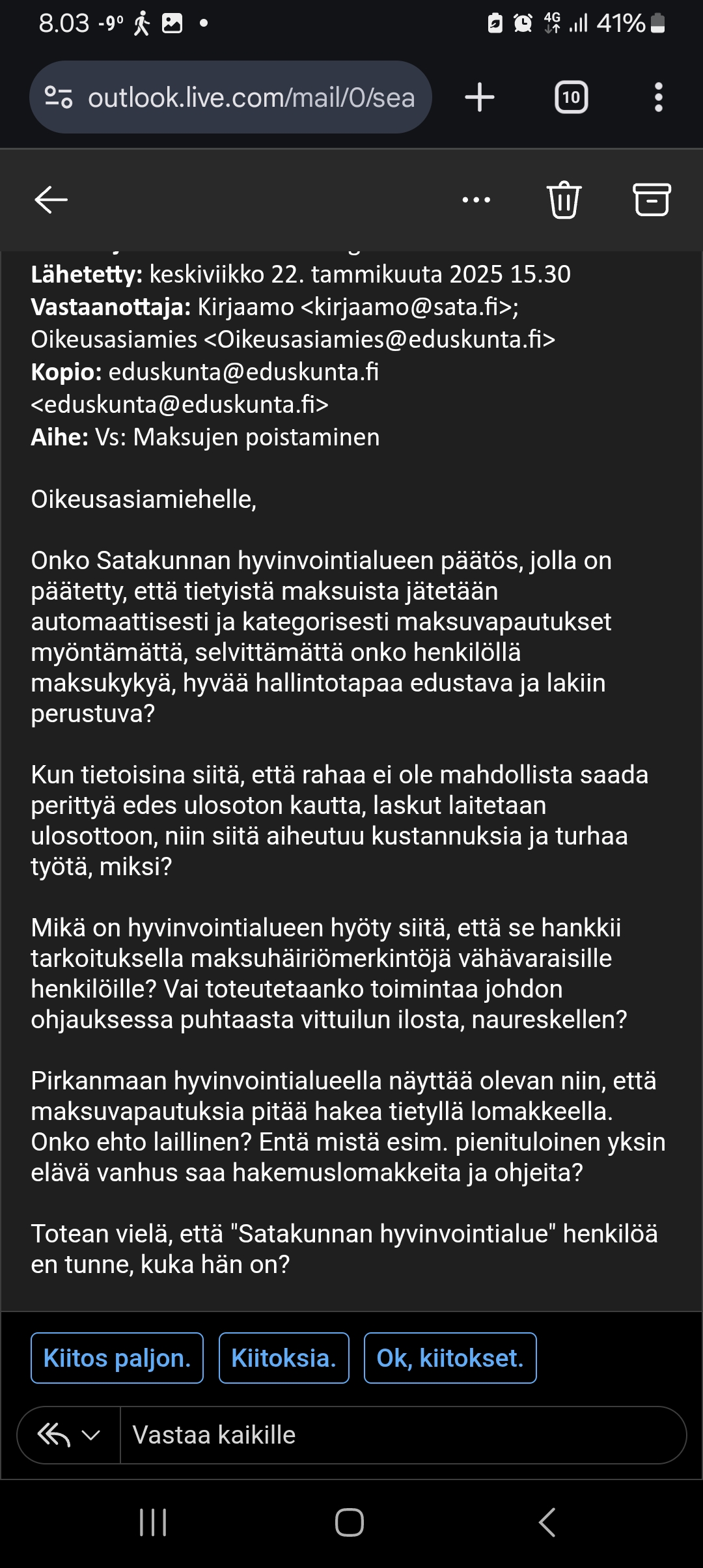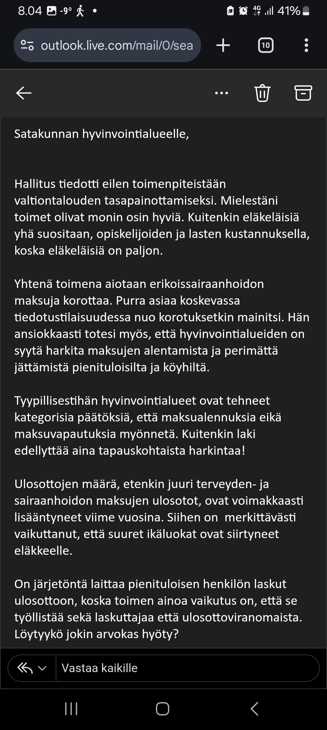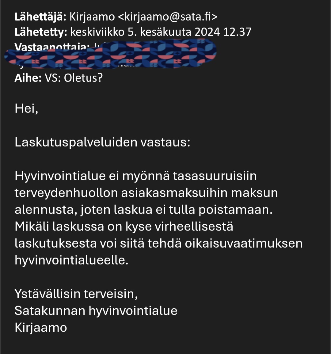 Kuten MTV3:n aamu-uutisista 12.1.2026 kuultiin niin monet pienituloiset jättävät terveydenhoidon palveluita käyttämättä, tai pitkittävät esim. lääkäriin menoa, korkeiden maksujen takia, uloston pelossa. Satakunnan hyvinvointialueen pöhköt(?) päättäjät ovat hölmöjen(?) viranhaltijoiden esityksestä hyväksyneet aikoinaan tehtäväksi, jopa lainvastaisena pidettävän, päätöksen, että tasasuuruisia maksuja ei koskaan alenneta tai poisteta. Hyvinvointialue on (sähköpostitse) ilmoittanut, että ulosottotoimista ei aiheudu kustannuksia. Onko tuosta olemassa laskelmia? Ehdotan, että niiltä asiakkailta, joilla ei ole oikeutta toimeentulotukeen ja joiden verotettavat tulot ovat alle tuhat euroa kuukaudessa ei perittäisi mitään asiakasmaksuja, sekä 1000€/kk. - 1666€/kk. tuloja saavien maksuja kohtuullistettaisiin esim. siten, että maksut voisivat olla yhteensä enintään 10% siitä kuukausitulosta, joka ylittää tuhat euroa. Esittämälläni tavalla saataisiin sekä inhimillisiä että taloudellisia säästöjä. Kustannukset olisivat varmasti ulosottokuluja pienempiä, eli kulut olisivat negatiivisia, eli tuloja!
